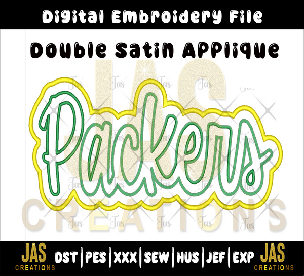 Show your team spirit with this Packers Double Satin Script Applique Embroidery Design! This digital file is perfect for game day outfits, fan gear, bags, hats, and more. Designed with a bold satin stitch outline and script lettering, this applique adds a professional and polished look to your embroidery projects.