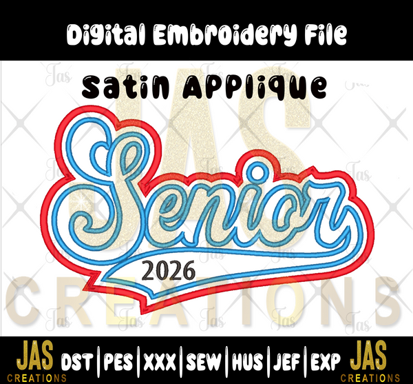 Create standout graduation apparel with this Double Satin Senior Retro Applique Digital Embroidery File! Designed with bold retro-style lettering and clean double satin stitch borders, this file is perfect for senior shirts, hoodies, sweatshirts, and keepsakes.