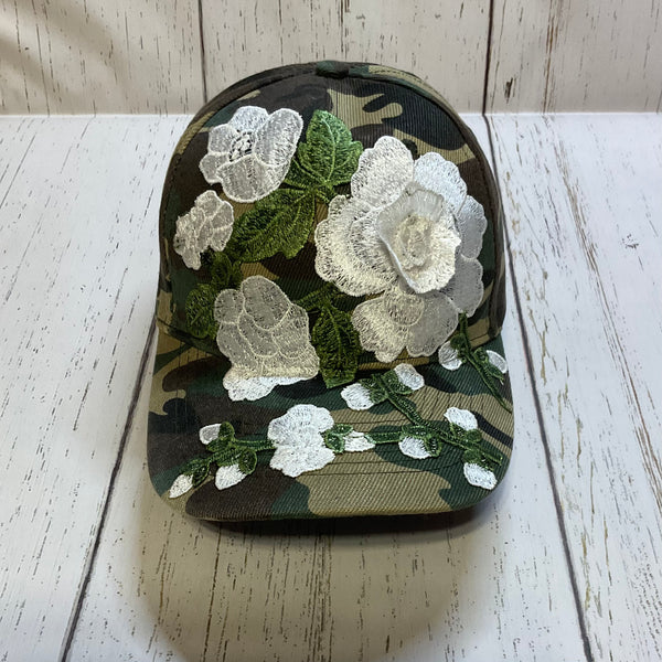 Design: Classic camouflage pattern hat with 3D lace floral embellishments